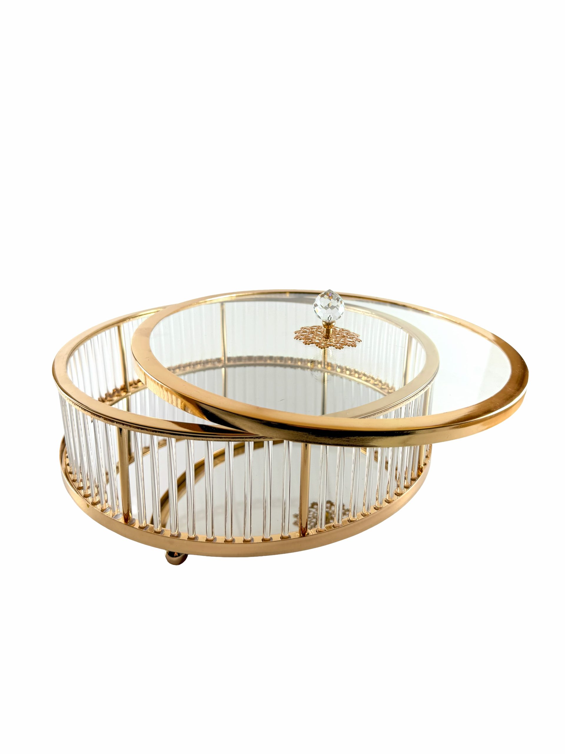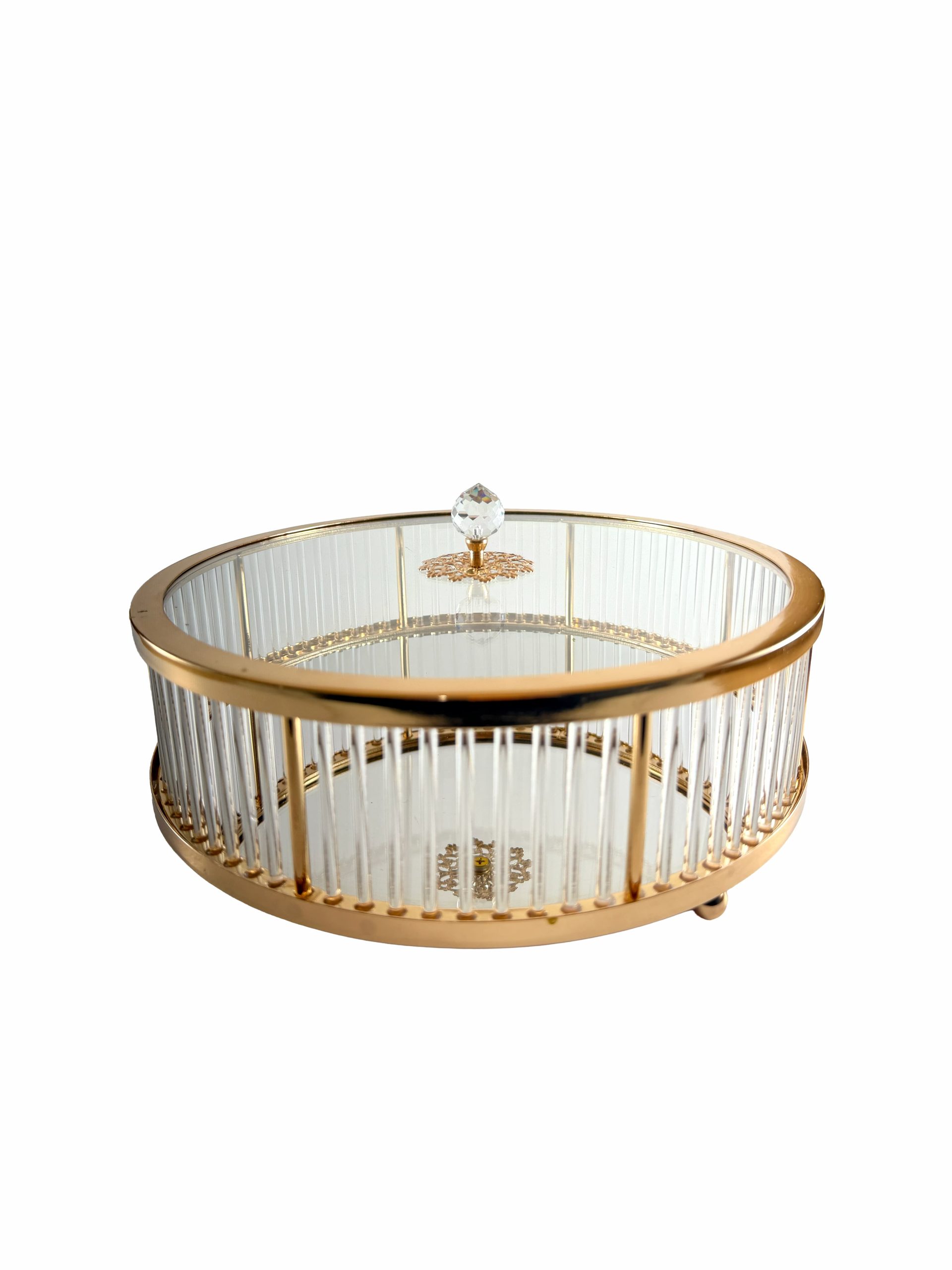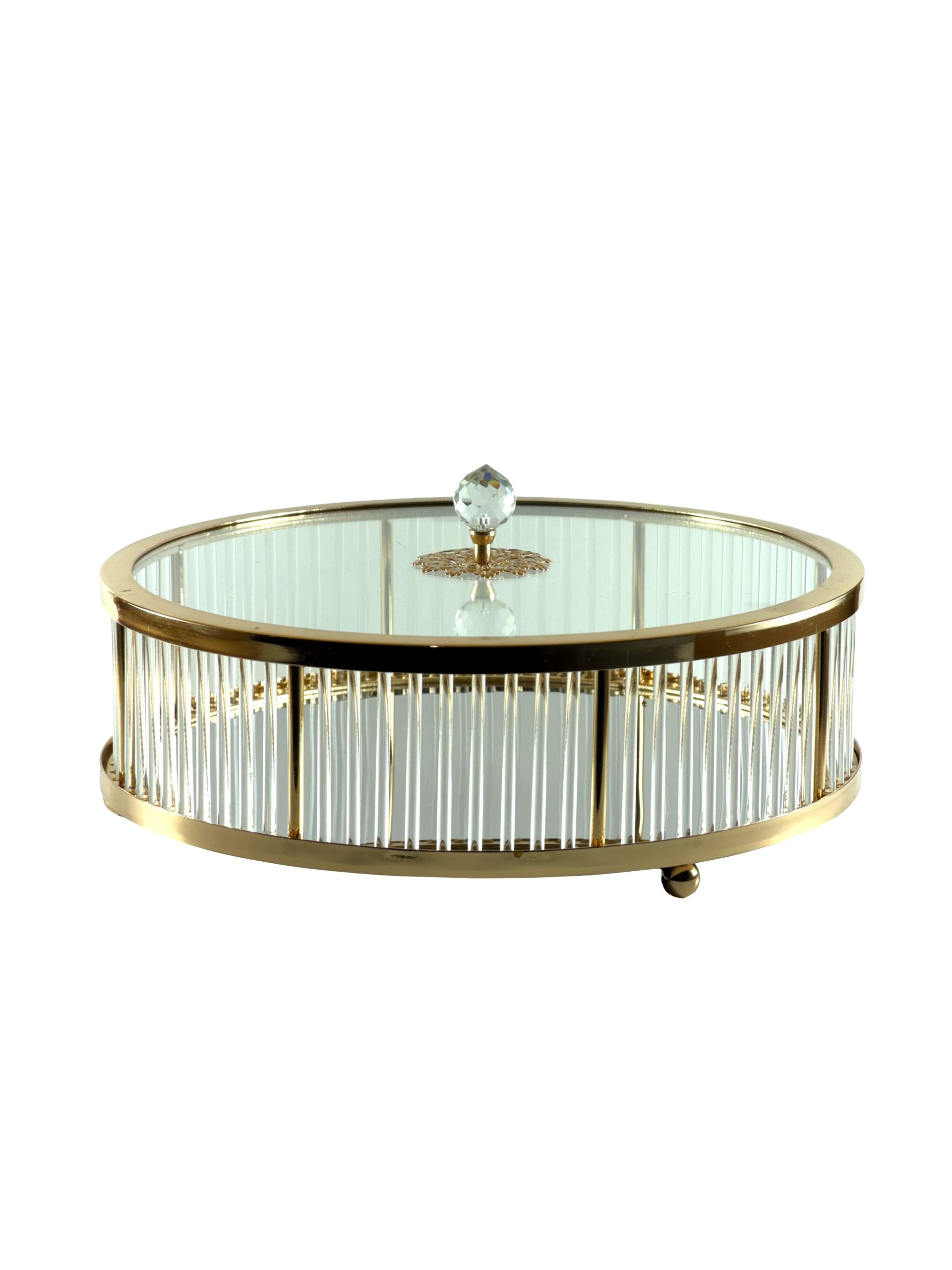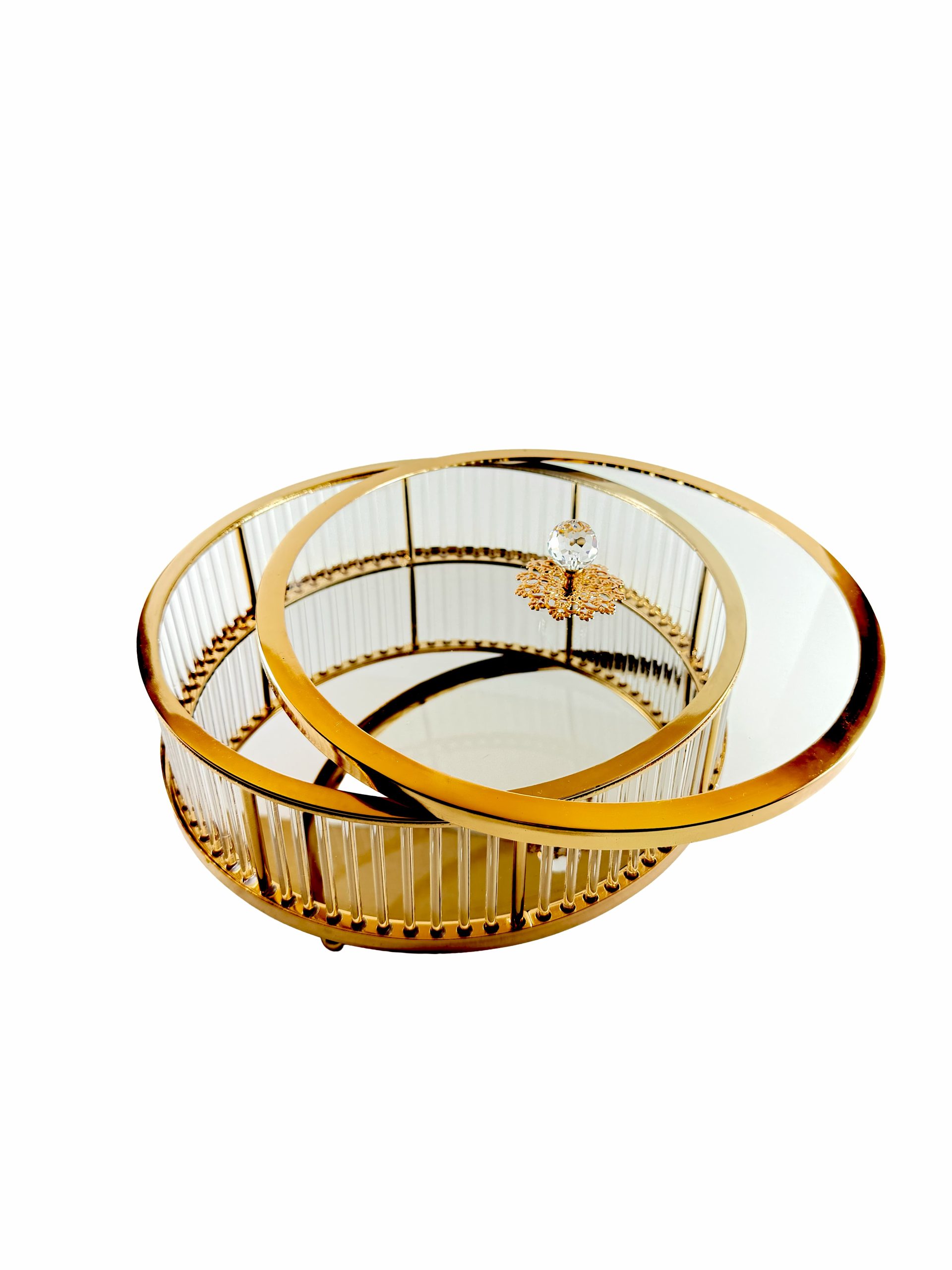 Altın Gold Aynalı Servis Tepsisi Kristal Detaylı Tekerlekli Lüks Sunum Tepsisi